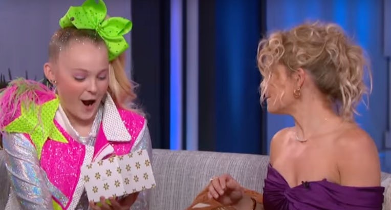 Now I’m sure the most pressing question on your mind is: Under what circumstances could the entertainment industry’s foremost gay icon and the Hallmark Channel’s former top Bible saleswoman have possibly met? The one example I can find of Jojo and Bure interacting is a 2019 episode of The Kelly Clarkson Show. In a clip of the encounter, Bure, self-proclaimed “Hallmark Queen of Christmas” gives gifts to Ellen, Jason Aldean, and Jojo, ensuring that the tiny, multichromatic crooner has an extra big bow on hers.