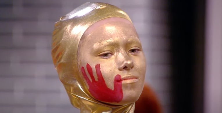 The View’s wardrobe supervisor Ashley Alderfer Kaufman saved the best for last, when she had a child trot out in a gold unitard with a Cast Away-esque handprint on his face.