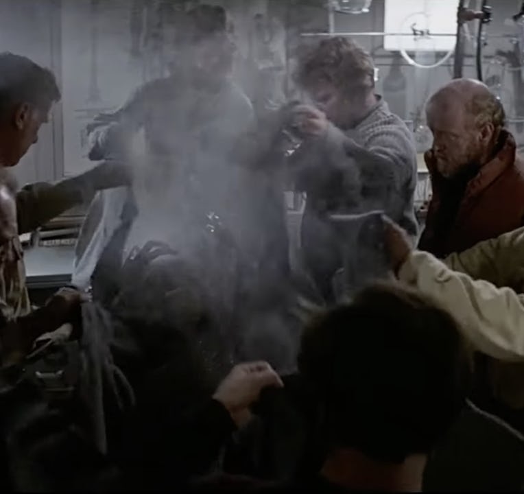 The Thing begins in the cold desert of Antarctica, where the inhabitants of the U.S. National Science Institute, Station 4, are killing time. The crew’s helicopter pilot, MacReady (Kurt Russell), plays chess against a computer. Two of the station’s doctors, Copper and Blair (Richard Dysart and Wilford Brimley, respectively), play table tennis in the rec room while the rest of the crew lounges. All the while, an alien in the guise of a husky runs through the snow, pursued by a Norwegian helicopter. The central conceit, and The Thing’s main draw as a piece of science fiction/horror, is the ability of the titular alien to shape-shift. It “assimilates,” taking the DNA of its host and replicating it. The discord and distrust that this seeds among the crew drives the film to its explosive conclusion. And while The Thing, as a creature and as a film, works as a metaphorical stand-in for many things, like paranoia and fear, or an abstracted illustration of Cold War tension, one of its more potent interpretations is as a litmus for racism.
