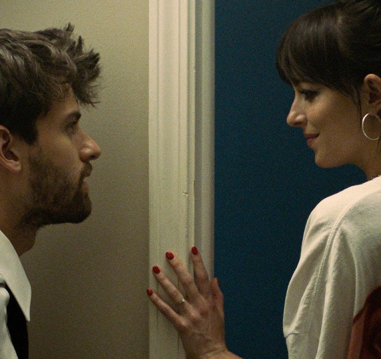 Every good coming-of-age story centers a sense of loss: of innocence, of control, of self-assurance. Being 22 is confusing not just because the answers don't seem to be clear, but because the questions aren't always apparent. We all go through this, and it sucks for everyone. Except Andrew, the protagonist of Cooper Raiff's Cha Cha Real Smooth, out in theaters and streaming on AppleTV+. Andrew, played by Raiff, finds himself beguiled by Domino (Dakota Johnson), a woman some ten years his senior whose daughter Lola (Vanessa Burghardt) attends the same school as his own little brother David (Evan Assante). Domino, Lola, and Andrew first meet at a bat mitzvah where the dance floor is a little sad and empty. Andrew takes it upon himself to pump up the party, betting Domino $300 that he can get Lola, who is autistic and a bit older than the kids in her grade, to dance with him, thus encouraging everyone else. Wielding his charm and wit, Andrew succeeds at securing Domino's attention and saving the party from the unforgiving wrath of preteen boredom. Soon enough, every Jewish mother in Livingston, NJ wants Andrew to be the party starter at her kid's bat or bar mitzvah, Andrew is in love with Domino (even though she's engaged), and Lola is attached to him.