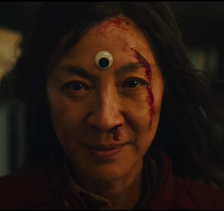 Stephen Chow came to mind when I watched the new film from the directors Daniel, Everything Everywhere All At Once. It follows Evelyn Wang, co-owner of a California laundromat, mother to frustrated, sidelined daughter Joy, wife to lame, overbearing husband Waymond, daughter to disappointed, grumpy father Gong Gong (Cantonese for “grandfather”). Wang is played by Michelle Yeoh, Waymond by Ke Huy Quan, Gong Gong by James Hong, three acting icons in their own right who, here, repeatedly outshine one another from scene to scene. Wang’s business is being audited by the IRS where Jamie Lee Curtis’s pious Deirdre waits to crush the family’s dreams. That is, until a Waymond from an alternate universe taps Evelyn to wake up and save reality from an all-consuming entity known as Jobu Tapaki.