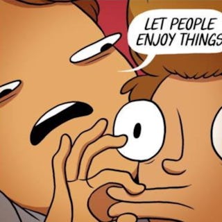 As much as I’d like to make the “let people enjoy things” problem about adults who enjoy comic books, it’s more deeply rooted: it is a pathological aversion, on a wide cultural level, to disagreement, discomfort, or being judged by others. “Let people enjoy things” is essentially the twitchy fear of “cancel culture,” translated over into the world of taste. There are reasons that it’s much more visible when it comes to comics, video games, and general fandom — among them, sheer numbers. But let’s not kid ourselves. It’s everybody’s problem.