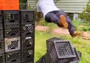 This is not an unreasonable position to take. In fact, if you watch any videos of the challenge — which involves trying to ascend and descend a pyramid assembled from stacked milk crates that may tip over or collapse into each other at any unfortunate moment — you might arrive at the same conclusion yourself. Here are some examples of the trend, which of course took off on TikTok (where the hashtag #cratechallenge is now unsearchable because of the risk of injury):