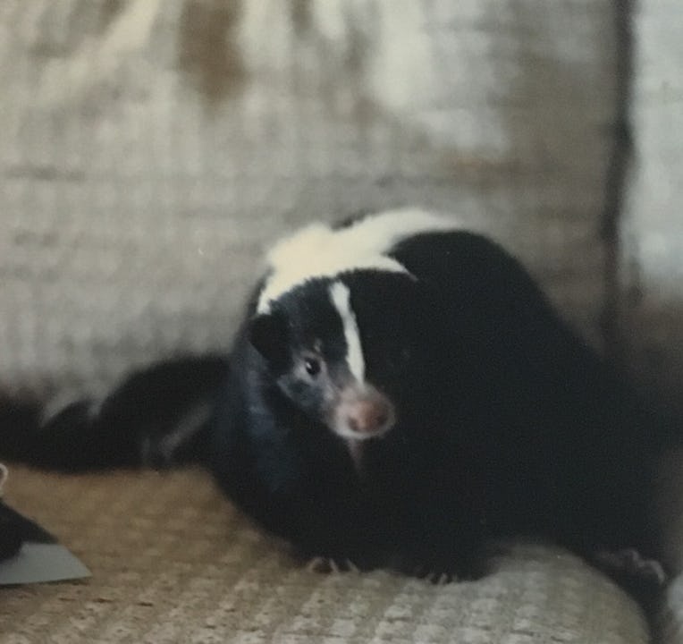 We got a skunk because our building didn’t allow dogs. There were no rules about skunks. My mother had pet skunks in Ohio, which she remembered fondly: Arpege, after the perfume; and Reesy, named after a lecture her friend gave about how pets are a "responsibility." I named my skunk Snoopy, after watching him explore the bathroom floor.