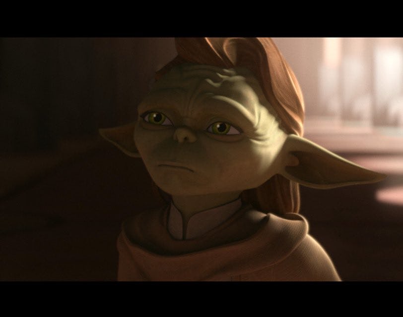 Now who is Yaddle, you may ask? Unfortunately, I don’t have the answer — I know basically nothing about Star Wars, having seen approximately 3.5 movies from the franchise in no particular order and none of the television shows. I know that there’s the Yoda, the one who like this talks. I “know” about Baby Yoda in that I’m aware through cultural osmosis that his real name is “Grogu.” This Yoda, however, Girl Yoda a.k.a. “Yaddle,” is entirely new to me. And I haven’t even gotten to the more revelatory fact, which is that she has hair? Or perhaps this was an executive decision made by Hollywood’s third most famous redhead herself.