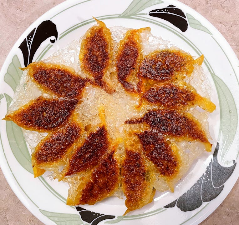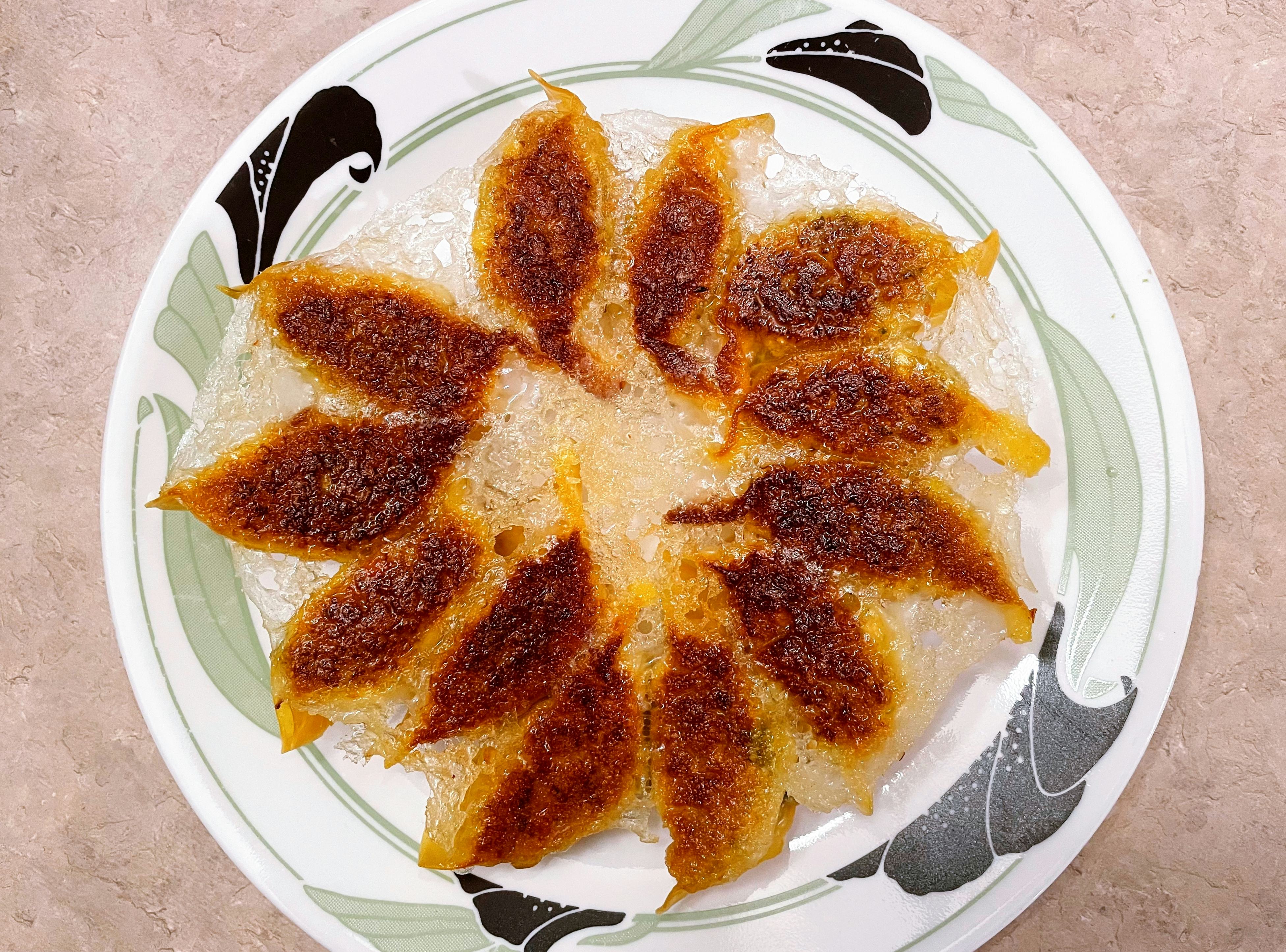 There are several ways to refer to the dish that is pan-fried dumplings with a fragile, golden-brown base formed of flour or starch: gyoza with skirt, gyoza with lattice, gyoza with crispy lace. My favorite is the Japanese hanetsuki gyōza (羽根つき餃子), or “gyoza with wings”; a close second is the Chinese bīnghuā jiānjiǎo (冰花煎饺), which translates to “ice crystal pan-fried dumplings.” Names are a kind of poetry — the best of them evoke something. I think of that every time I attempt to make these wings for my dumplings, which is not as easy a task as it appears. Invariably, my slurry’s ratio of flour and cornstarch to water will be off, and the lattice ends up thick and flaccid rather than delicately, shatteringly crisp. I have done it correctly just once. My homemade vegetarian dumplings were joined together by a crackly crust, as fine as a layer of frost spreading on a pane of glass. They sprouted wings, and when they soared into my mouth — bathed in a sauce of soy sauce, black vinegar, chili oil, and minced garlic — they were delicious. 4/5 stars.