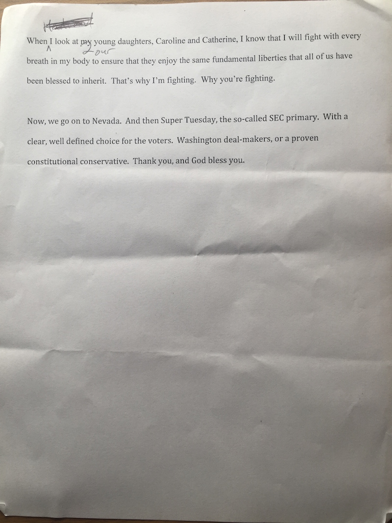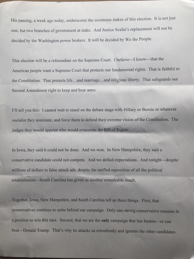 This is the actual copy of the speech Ted read at his primary party at the South Carolina State Fairgrounds, though it’s unclear to whom the handwriting belongs.