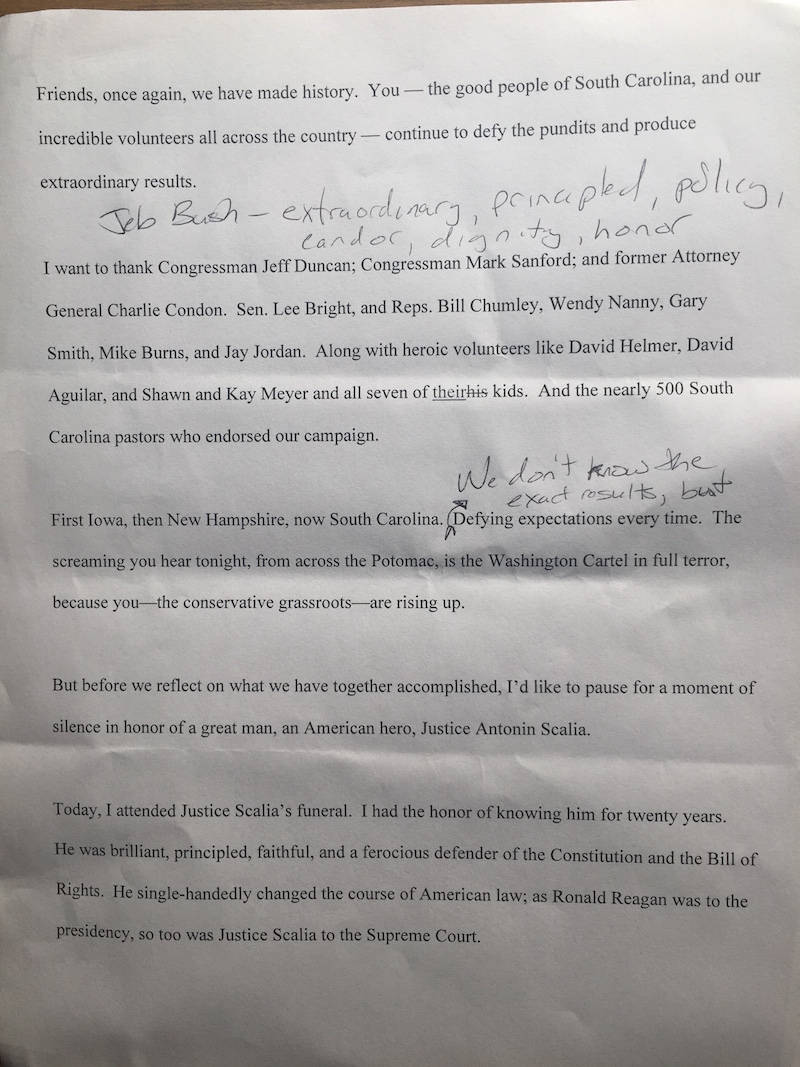 Here Are the Handwritten Edits to Ted Cruz's Victory Speech After He Lost South Carolina