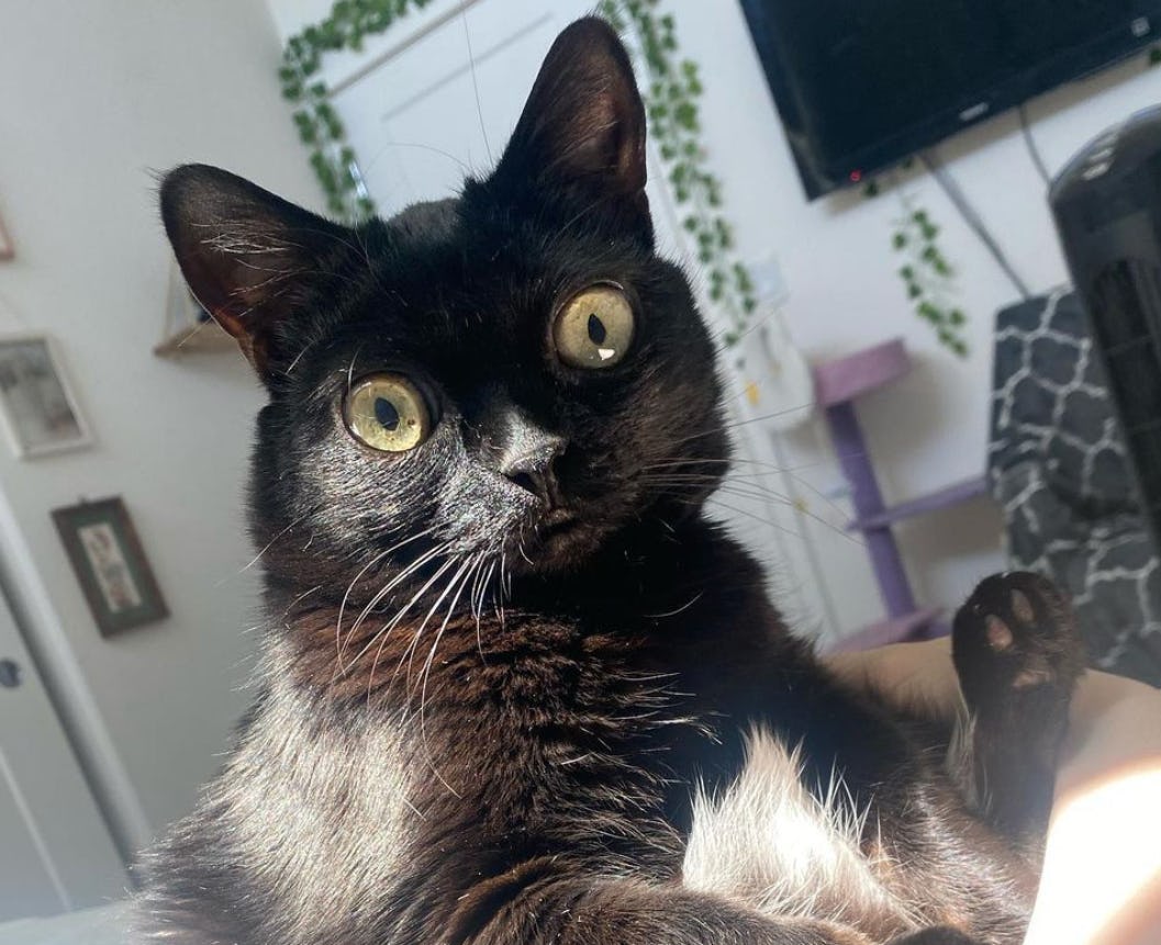 Jinx’s caretaker, Mia, found her in 2018, abandoned as a three-week-old in a field behind Mia’s backyard. As Jinx grew, Mia noticed her eyes and feet were becoming abnormally large. The physical abnormalities, of course, made her perfect (“perfect”) (“purrfect”) for online stardom. (She reportedly remains healthy despite them.)